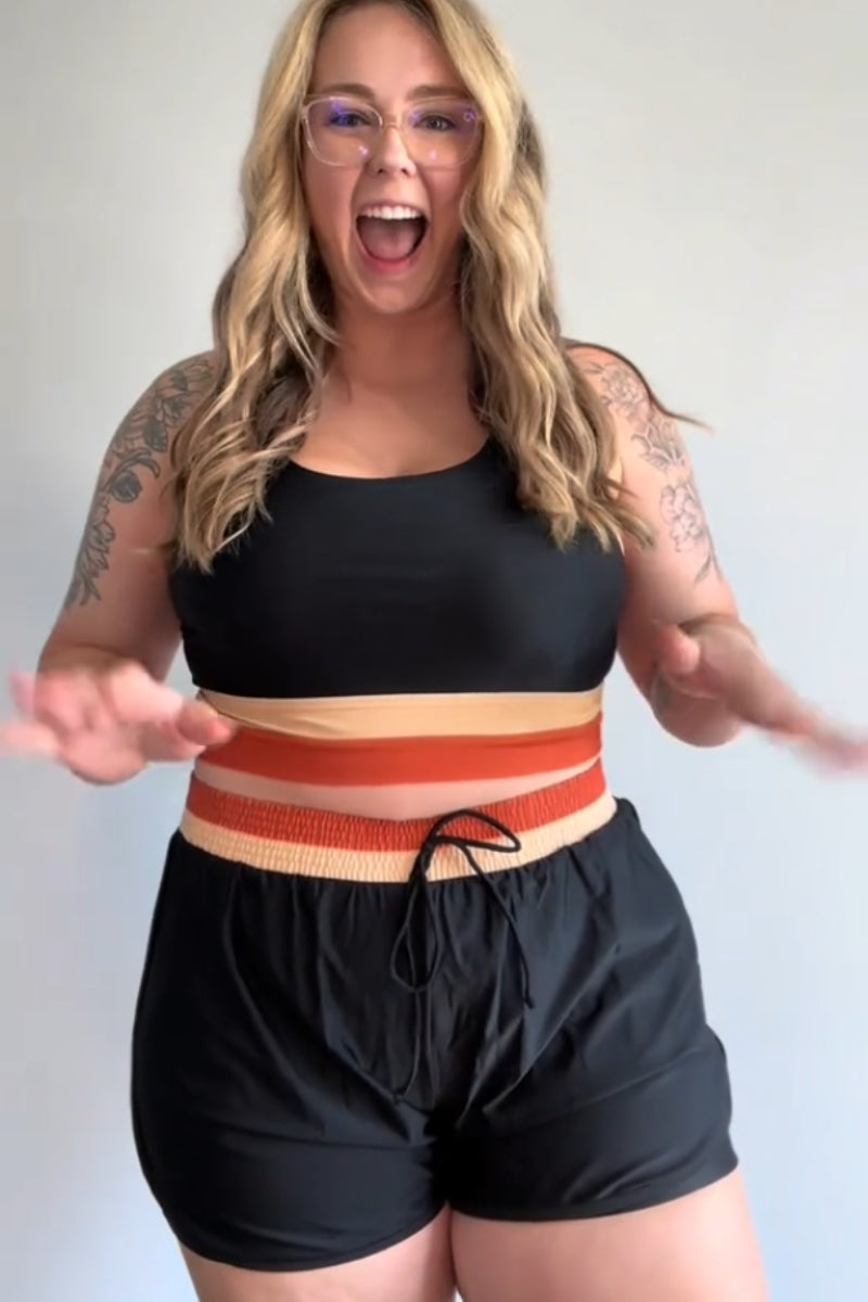 Crafted with a modern and sleek design, this bikini features a scoop neckline and wide shoulder straps for added comfort. The racerback style provides a secure fit, making it ideal for active wear. The black color-blocking adds a bold and stylish contrast. The high-waisted boy shorts come with an elastic waistband, offering both flexibility and support. With functional pockets, the boy shorts provide convenience without compromising on style, making this swimsuit both practical and chic for any occasion.